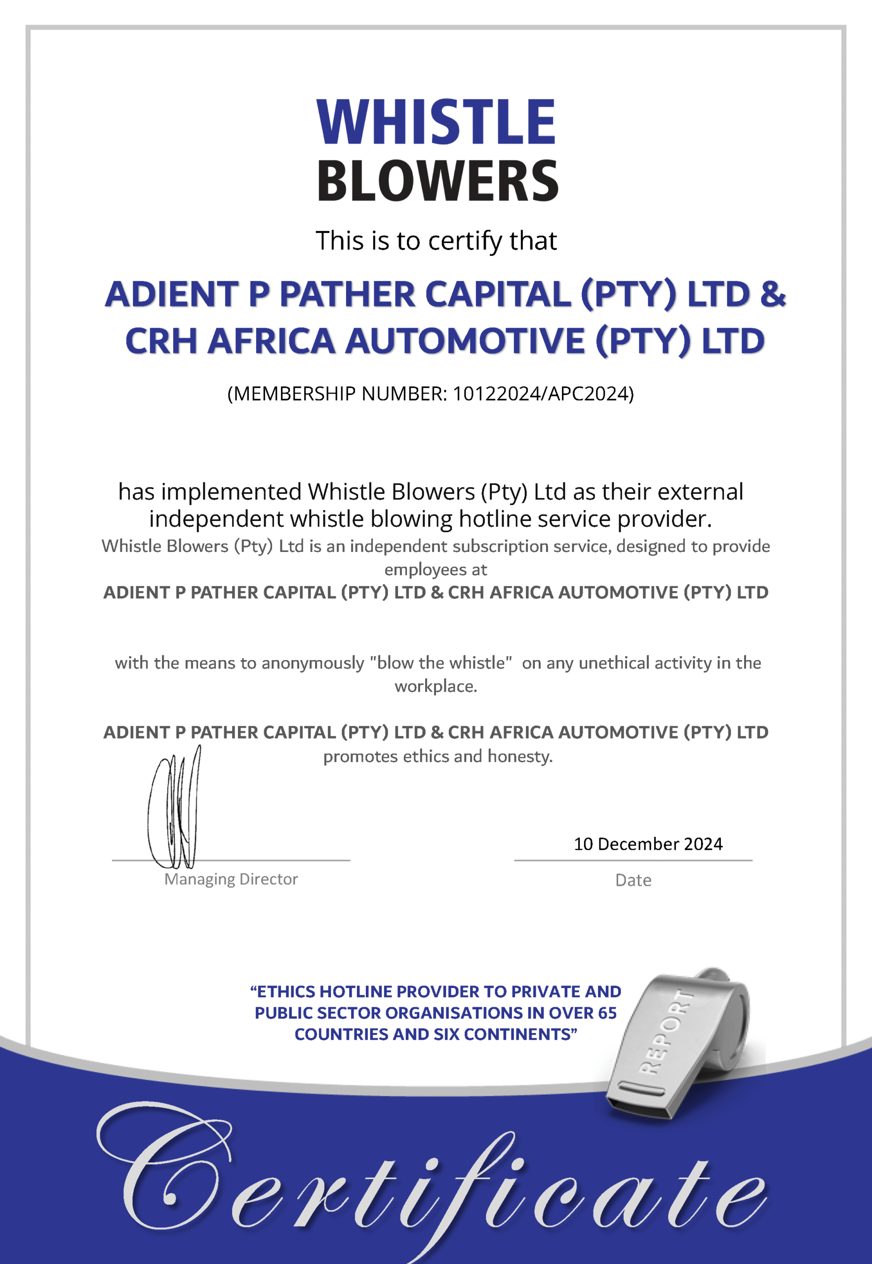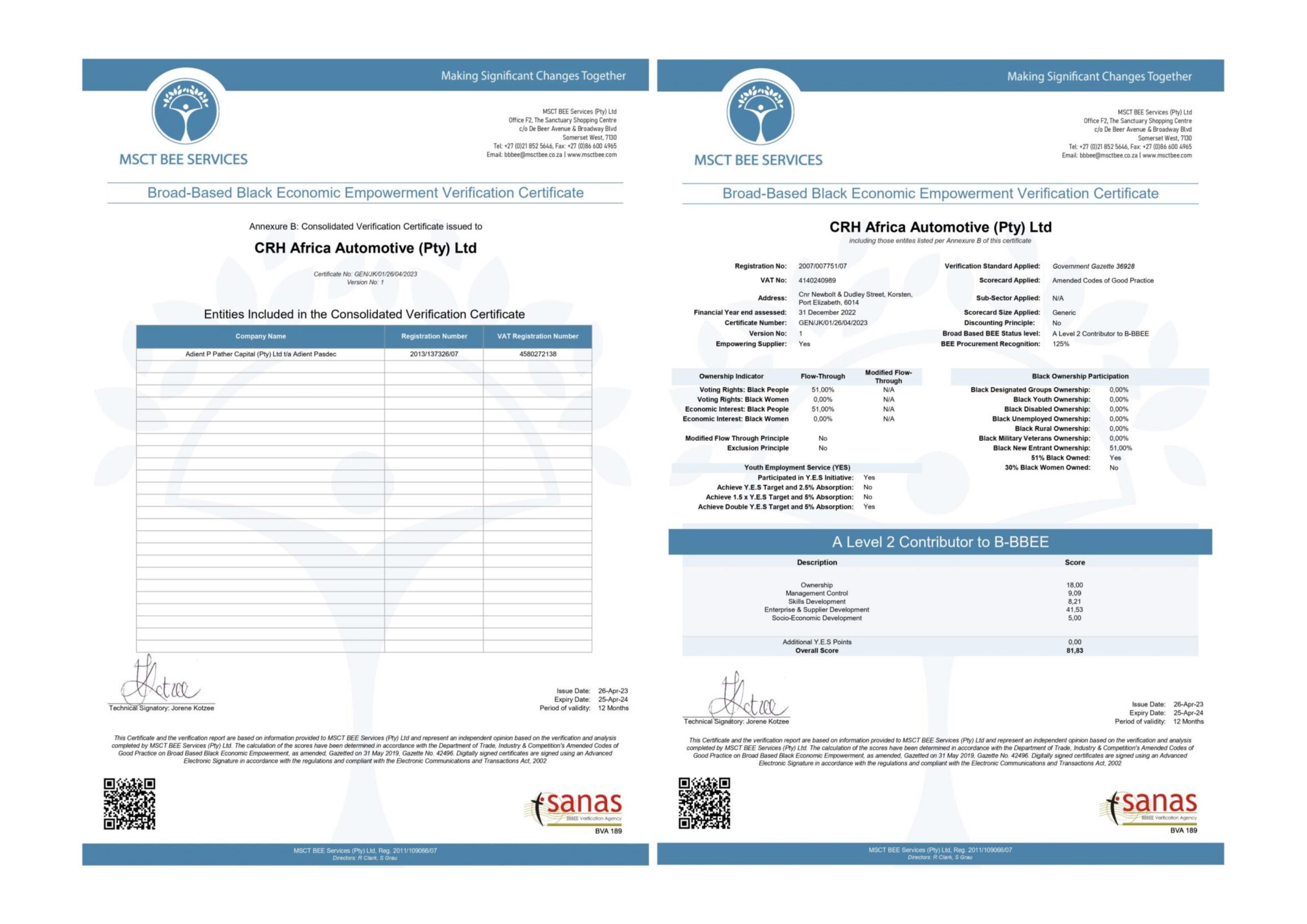 CRH-Africa (PTY) LTD and subsidiary Adient|PPC company are industry leaders in metals technologies and manufacturing, offering global customer service excellence. CRH-Africa is a leading supplier of world-class metal-pressed components, welded and riveted assemblies. Adient|PPC is an industry expert in metal seat structures, tube bending and various welding methods, including laser welding. CRH-Africa and Adient|PPC are proud BBBEE level 2 contributors with 51% black shareholding.