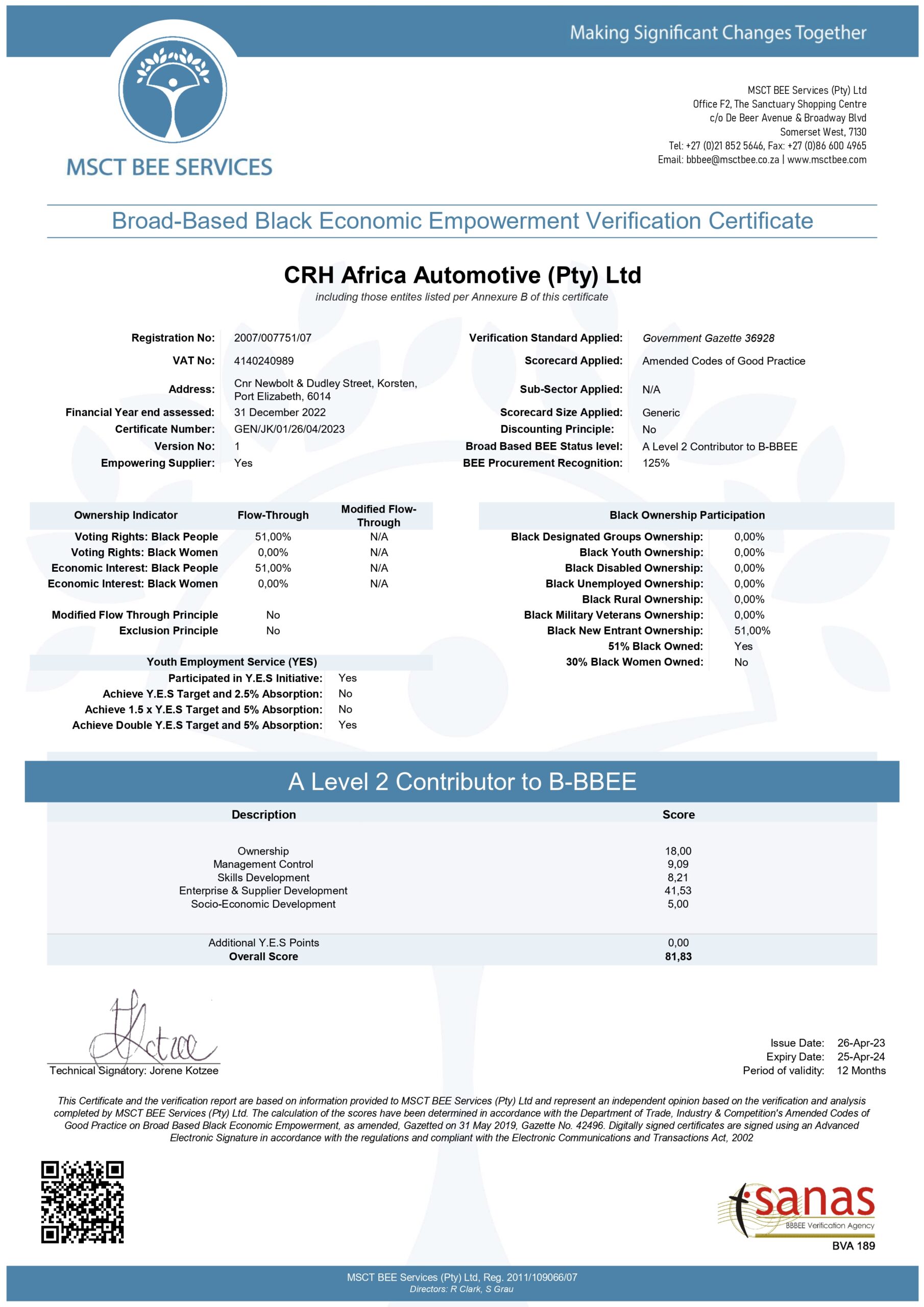 CRH-Africa successfully launched our manufacturing footprint in the KwaZulu-Natal region in August 2024, reinforcing its support for the local automotive sector and advancing deeper localisation efforts.
